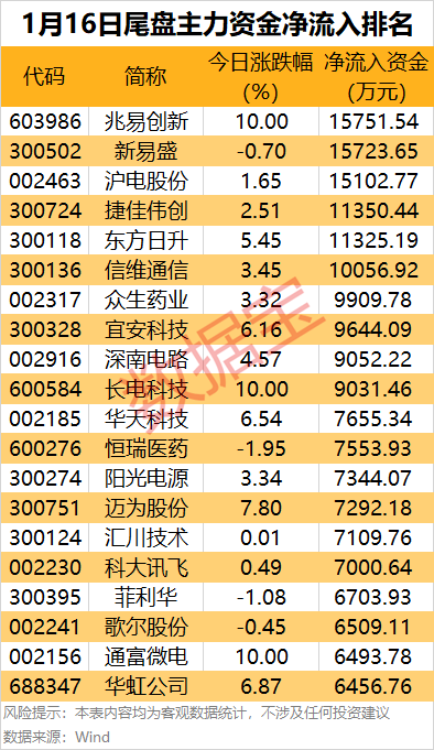 存储芯片概念股兆易创新涨停,尾盘主力资金净流入1.58亿元,居首;新易盛、沪电股份和捷佳伟创等尾盘获主力资金大幅加仓。