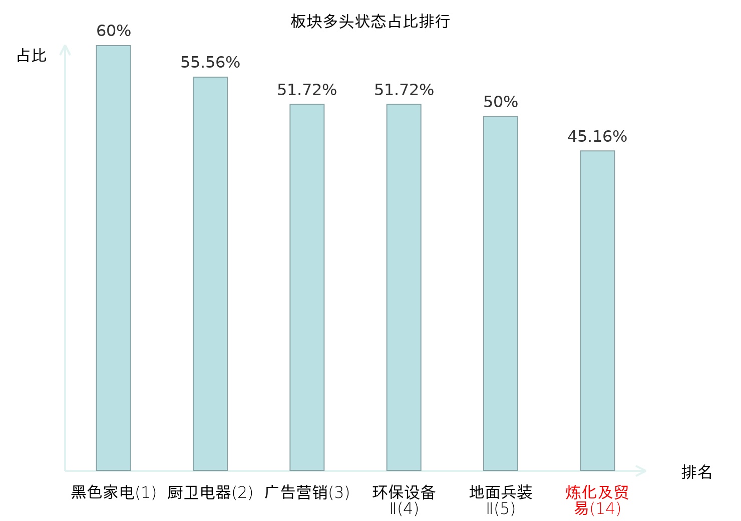 全市场所有行业板块中主力多头状态占比排名中,黑色家电板块位居第一。保险Ⅱ板块名次提升最快,较昨日上升118位。