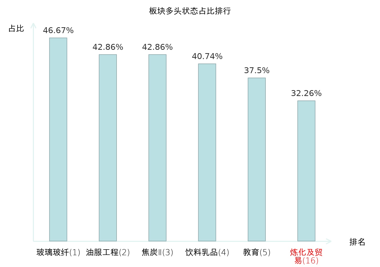 全市场所有行业板块中主力多头状态占比排名中,玻璃玻纤板块位居第一。航空机场板块名次提升最快,较昨日上升43位。