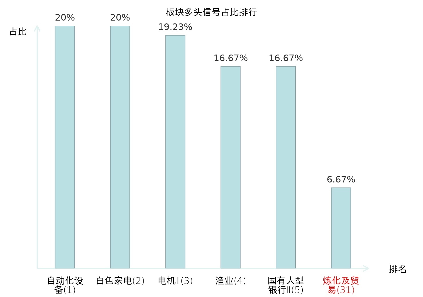 全市场所有行业板块中主力多头信号占比排名中,自动化设备板块位居第一。渔业板块名次提升最快,较昨日上升118位。