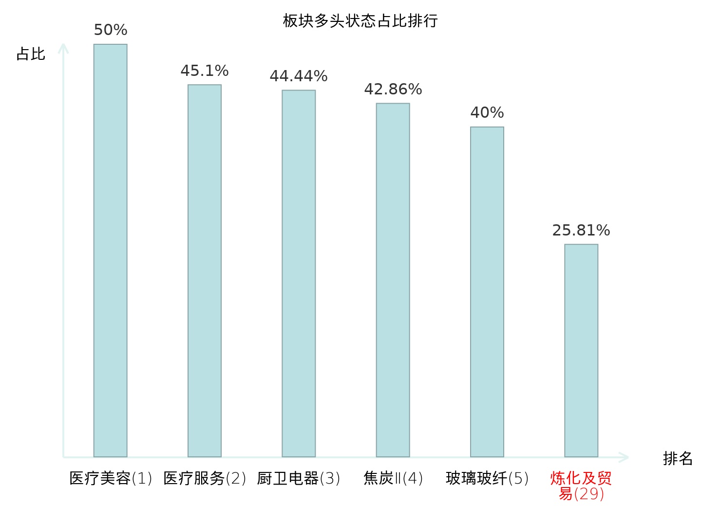 全市场所有行业板块中主力多头状态占比排名中,医疗美容板块位居第一。养殖业板块名次提升最快,较昨日上升90位。