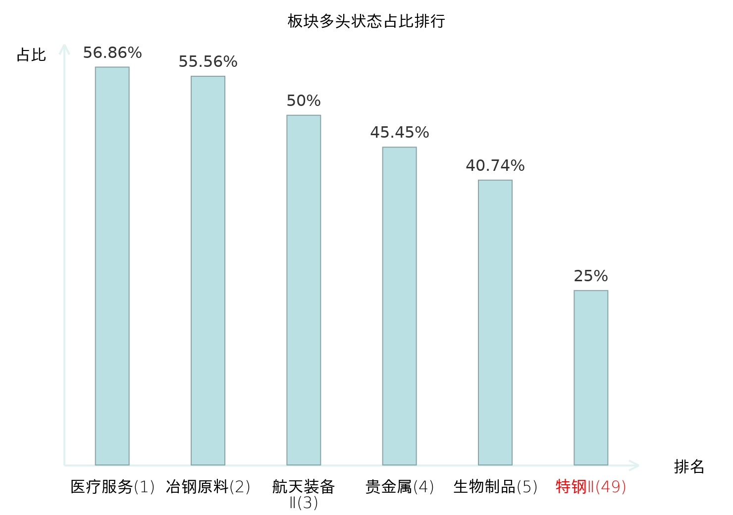 全市场所有行业板块中主力多头状态占比排名中,医疗服务板块位居第一。医疗美容板块名次提升最快,较昨日上升75位。