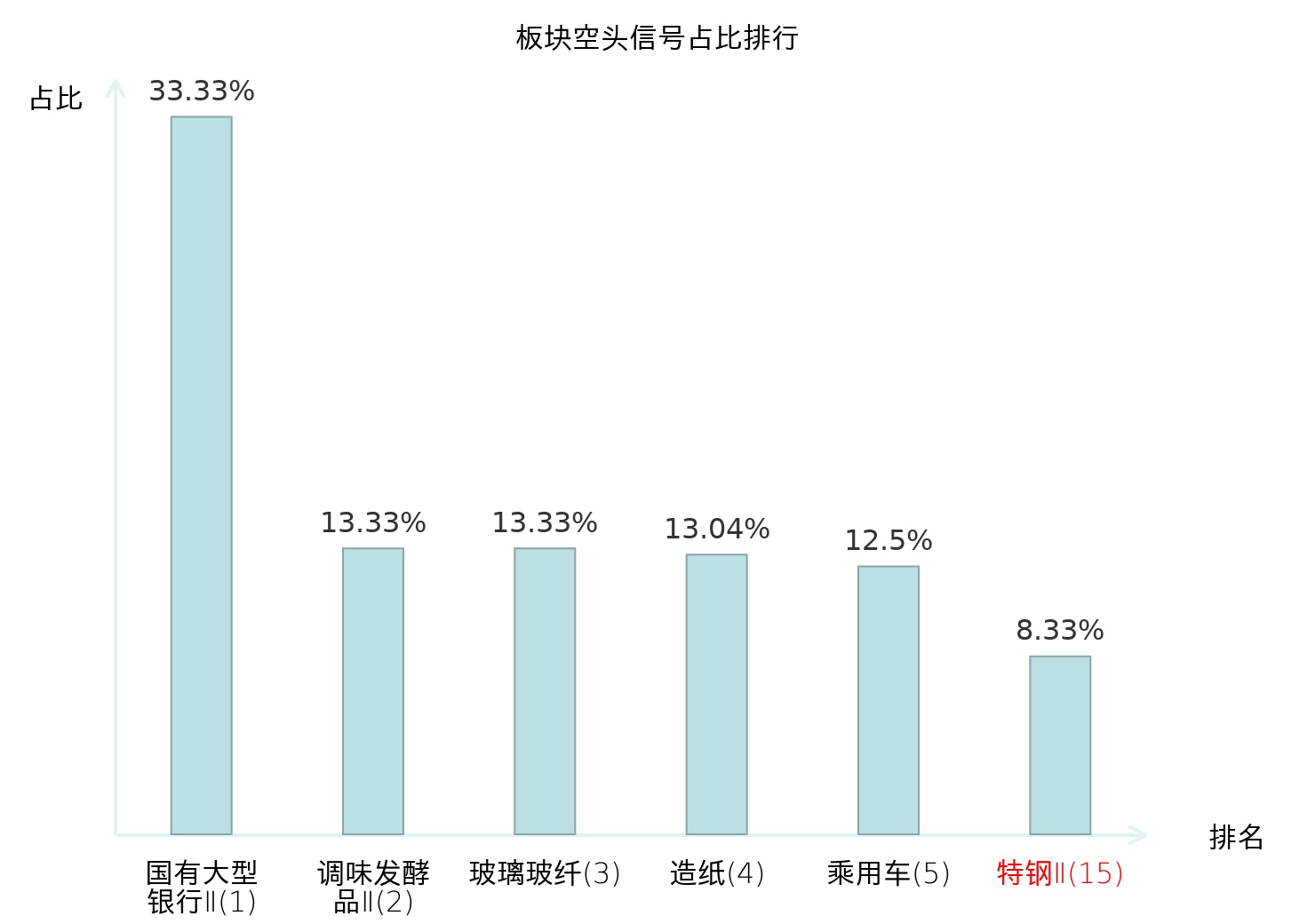 全市场所有行业板块中主力空头信号占比排名中,国有大型银行Ⅱ板块位居第一。化学制品板块名次提升最快,较昨日上升117位。