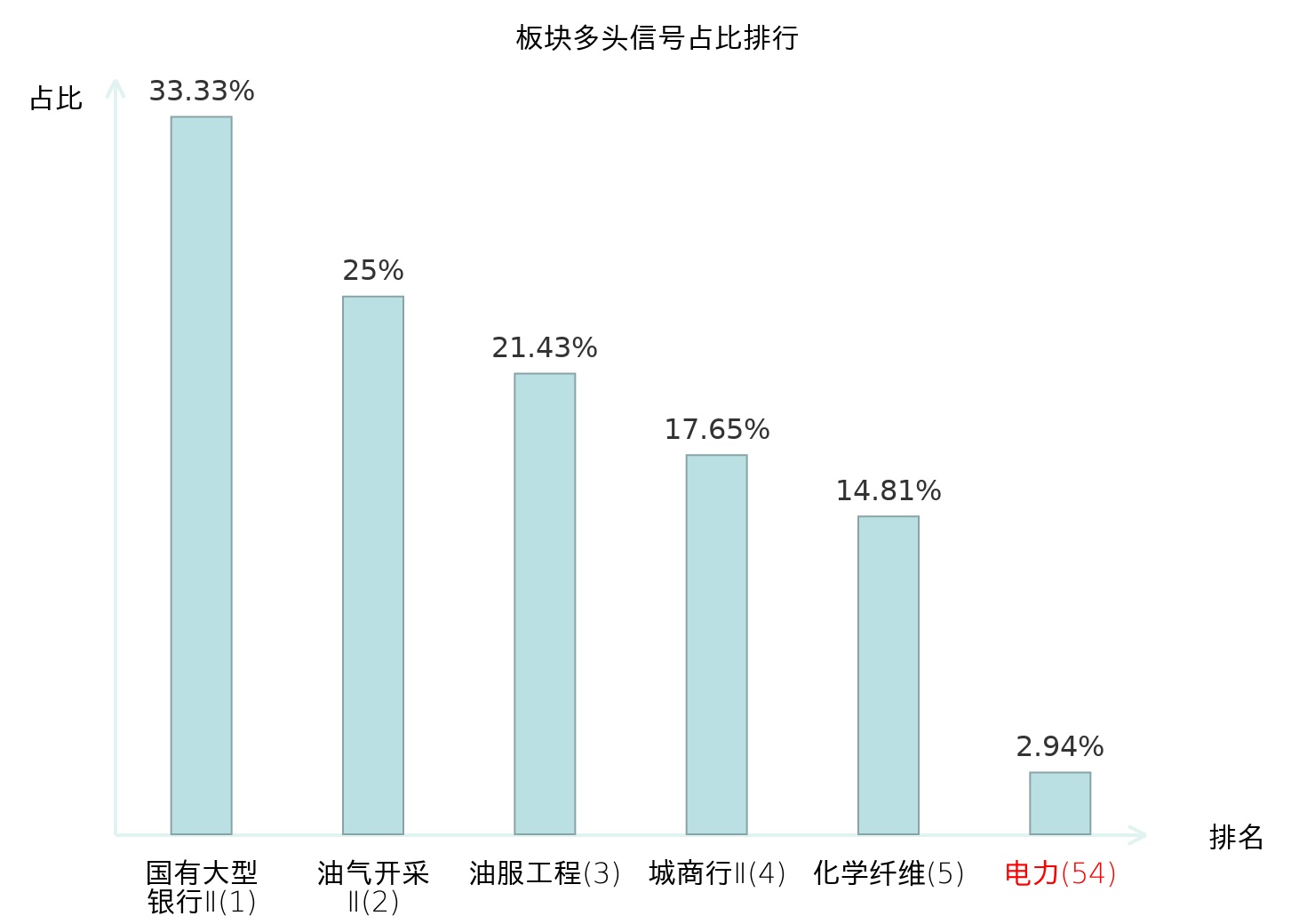 全市场所有行业板块中主力多头信号占比排名中,国有大型银行Ⅱ板块位居第一。国有大型银行Ⅱ板块名次提升最快,较昨日上升124位。