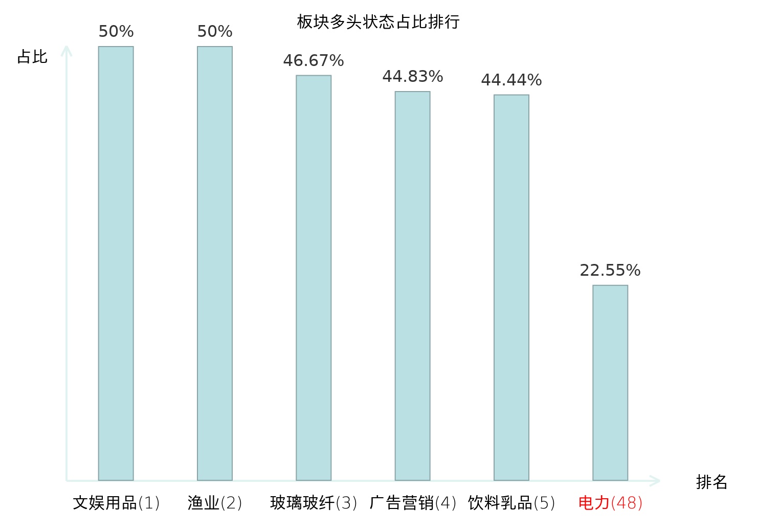 全市场所有行业板块中主力多头状态占比排名中,文娱用品板块位居第一。饮料乳品板块名次提升最快,较昨日上升59位。