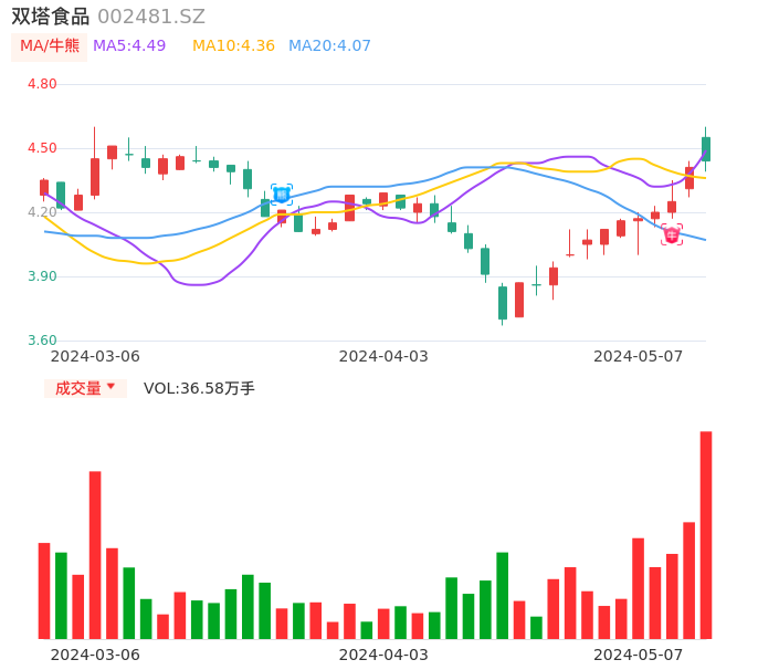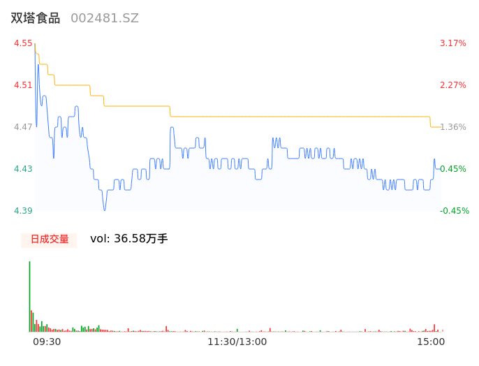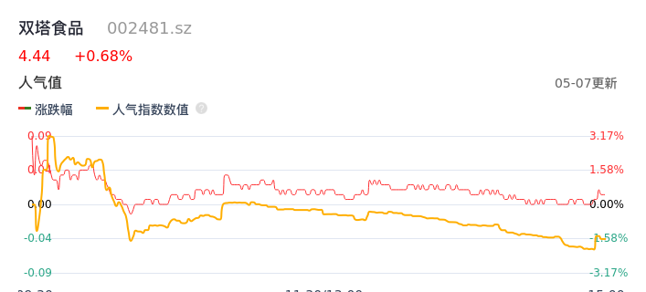 05月07日,双塔食品收报4.44,股价涨幅0.68%,成交金额1.64亿元,换手率3.27%。