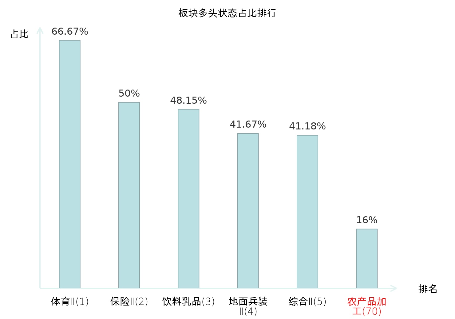 全市场所有行业板块中主力多头状态占比排名中,体育Ⅱ板块位居第一。种植业板块名次提升最快,较昨日上升70位。