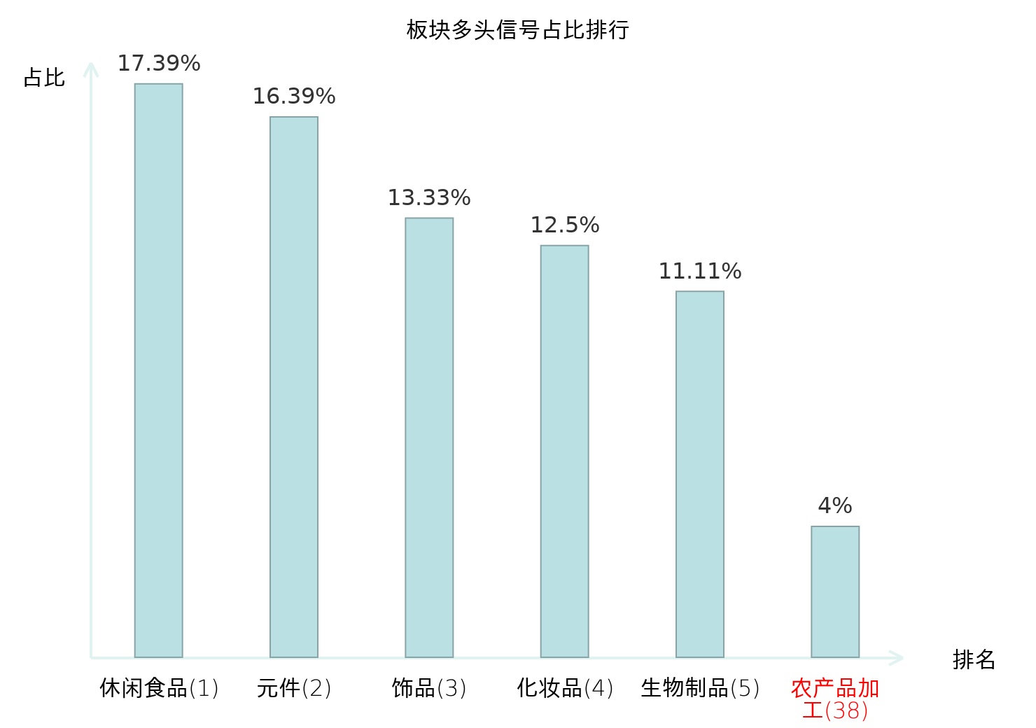 全市场所有行业板块中主力多头信号占比排名中,休闲食品板块位居第一。厨卫电器板块名次提升最快,较昨日上升108位。