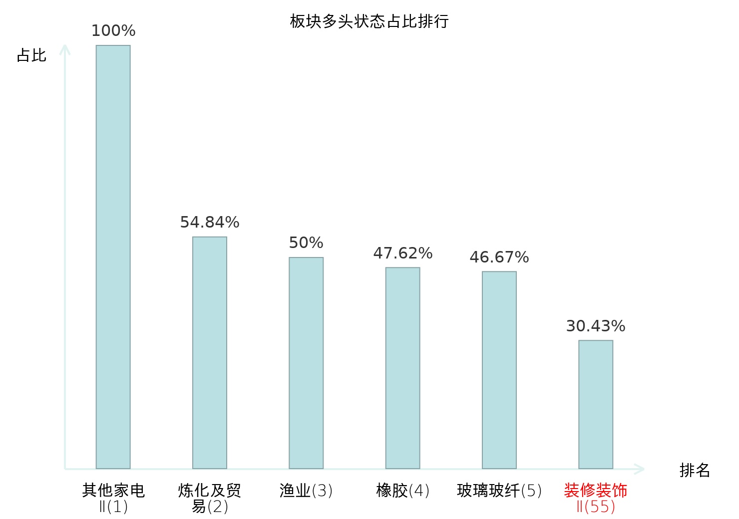 全市场所有行业板块中主力多头状态占比排名中,其他家电Ⅱ板块位居第一。铁路公路板块名次提升最快,较昨日上升37位。