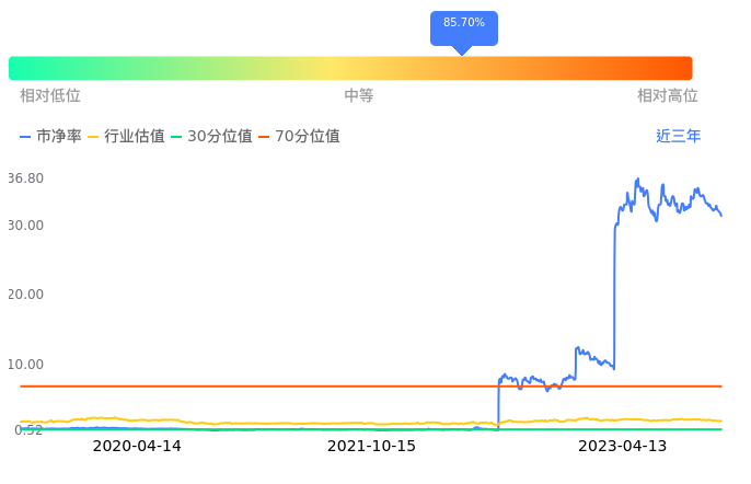 ST广田当前市净率PB为31.55,在所属的装修装饰中,市净率PB排23,前五名分别为亚厦股份市净率0.82、中装建设市净率0.96、洪涛股份市净率0.96、金螳螂市净率1.16、豪尔赛市净率1.26。ST广田当前市净率PB为31.34,超过近3年85.70%的历史数据。