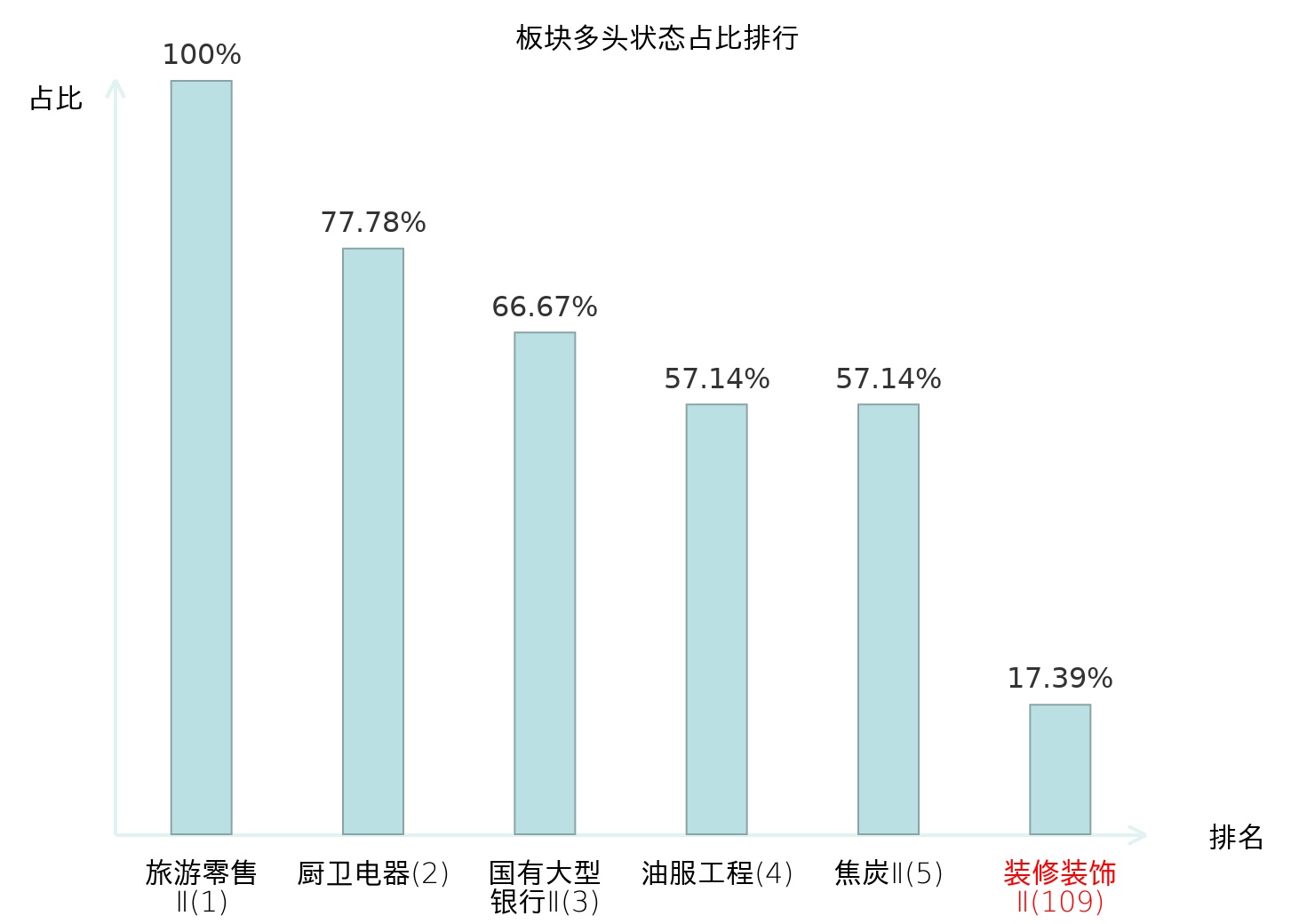 全市场所有行业板块中主力多头状态占比排名中,旅游零售Ⅱ板块位居第一。房地产服务板块名次提升最快,较昨日上升71位。
