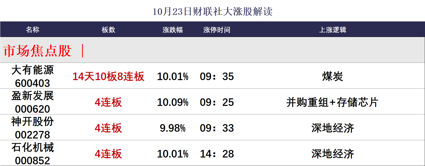 财联社10月23日讯,今日58股涨停,14股炸板,封板率为81%,大有能源14天10板,石化机械、神开股份、盈新发展4连板,世龙实业3连板,山东墨龙5天4板,安泰集团6天4板。市场探底回升,三大指数全线收红。沪深两市成交额1.64万亿,较上一个交易日缩量239亿。板块方面,深圳国企改革、煤炭、能源金属等板块涨幅居前,培育钻石、工程机械、油气等板块跌幅居前。截至收盘,沪指涨0.22%,深成指涨0.22%,创业板指涨0.09%。