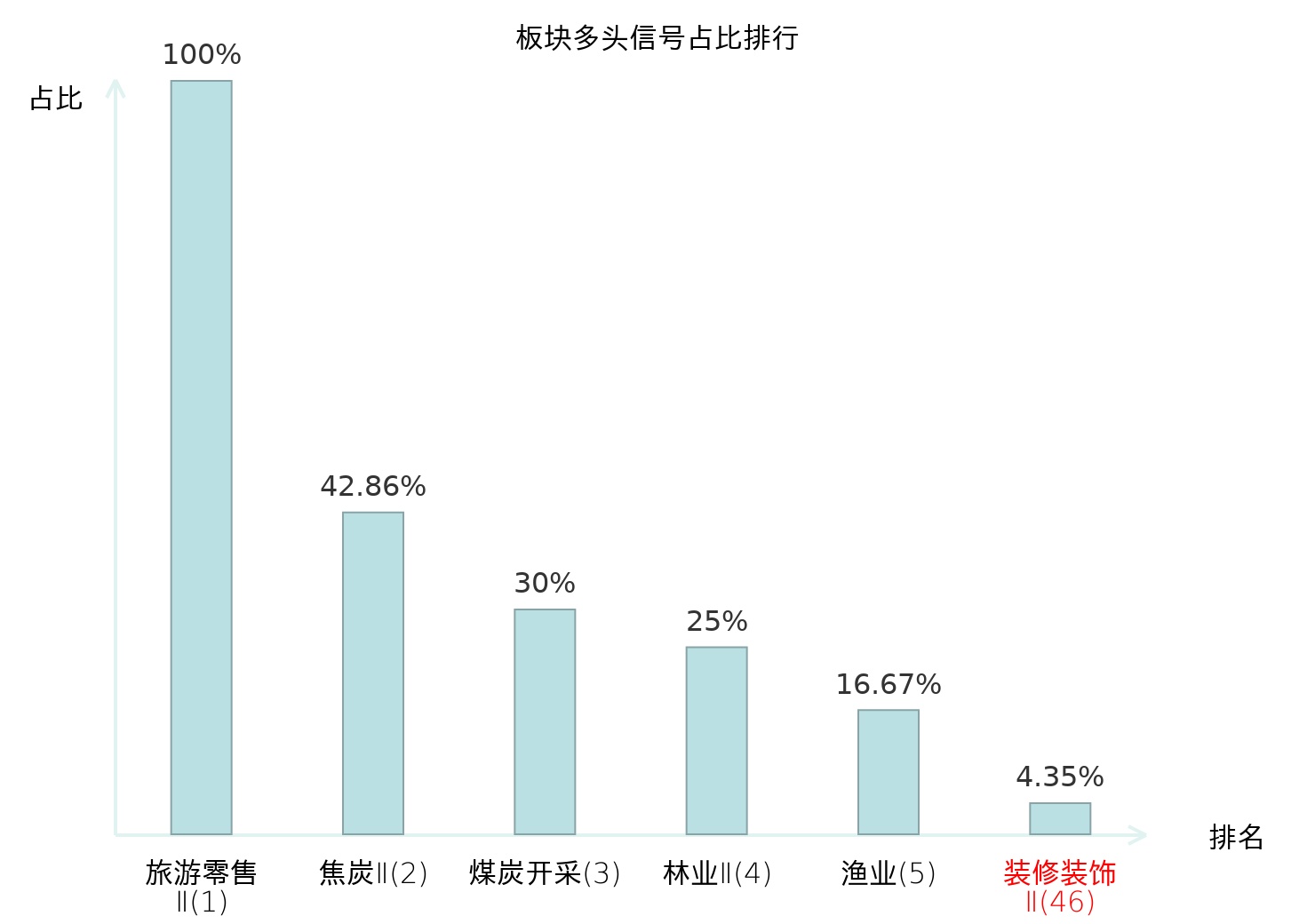 全市场所有行业板块中主力多头信号占比排名中,旅游零售Ⅱ板块位居第一。旅游零售Ⅱ板块名次提升最快,较昨日上升130位。