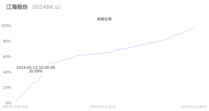 002484江海股份2024年05月13日成交9.67万手,成交金额1.57亿元,相较昨日缩量1.45万手,换手率1.22%,成交清淡。