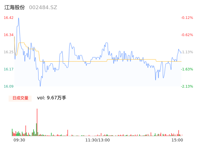 05月13日,江海股份收报16.25,股价涨幅-1.16%,成交金额1.57亿元,换手率1.22%。