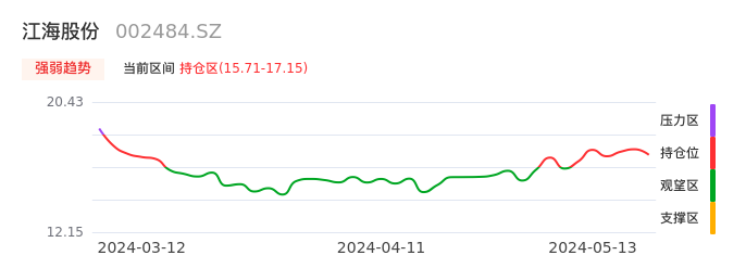 我们来看一下该股的九方特色指标强弱趋势的情况:江海股份自05月06日从观望区上穿到持仓区。股价近期在多头区域回调整理。后续重点关注多空分界点的争夺:15.71元。如未能有效站稳则可能重新回到空头行情。