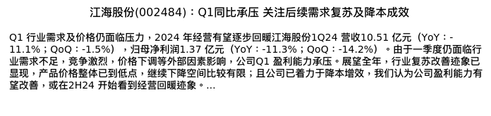 值得注意的是:2024年05月华泰证券的陈旭东/黄乐平/王心怡分析师,首次发布关于江海股份的研究报告,标题为:江海股份(002484):Q1同比承压 关注后续需求复苏及降本成效。