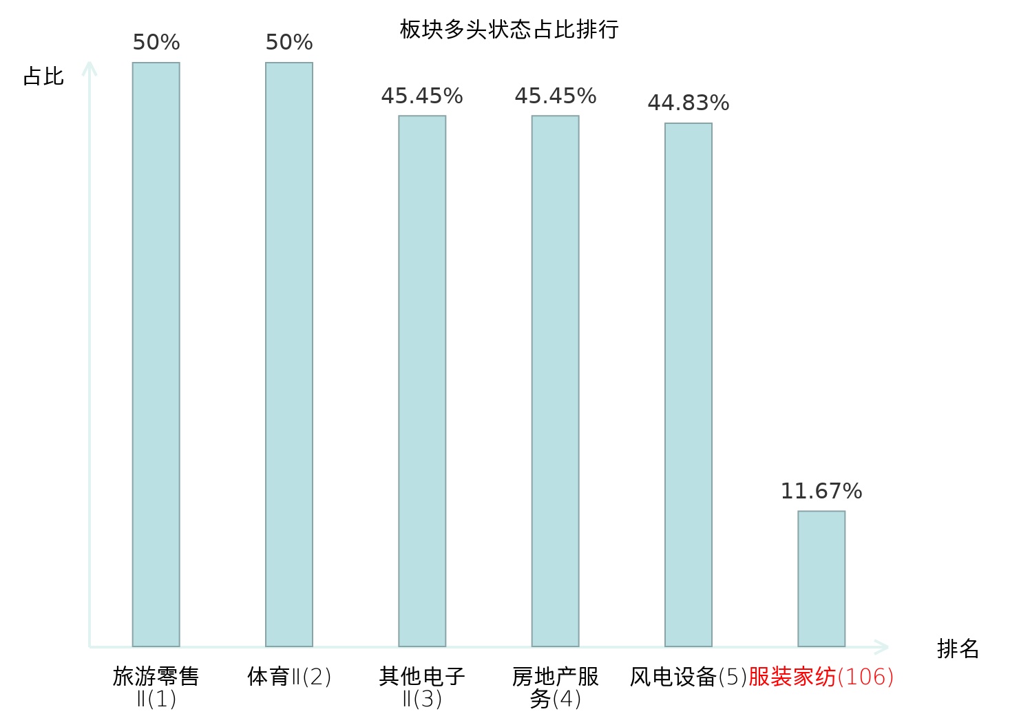 全市场所有行业板块中主力多头状态占比排名中,旅游零售Ⅱ板块位居第一。其他家电Ⅱ板块名次提升最快,较昨日上升112位。
