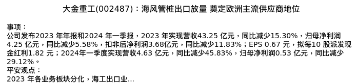 值得注意的是:2024年04月平安证券的皮秀分析师,首次发布关于大金重工的研究报告,标题为:大金重工(002487):海风管桩出口放量 奠定欧洲主流供应商地位。