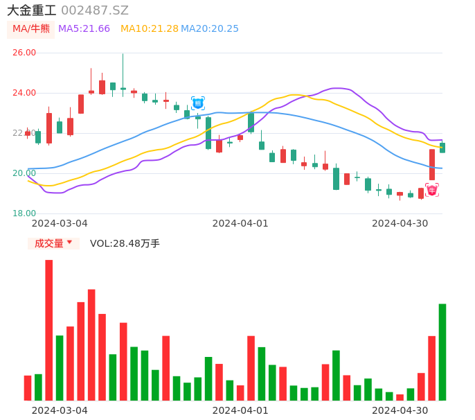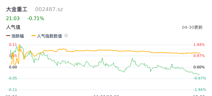 04月30日,大金重工收报21.03,股价涨幅-0.71%,成交金额6.07亿元,换手率4.52%。