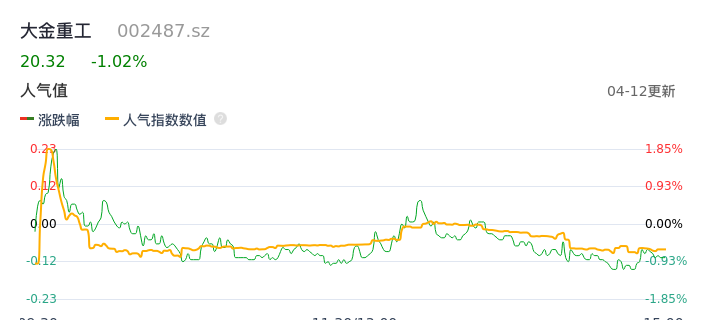 04月12日,大金重工收报20.32,股价涨幅-1.02%,成交金额1.69亿元,换手率1.31%。