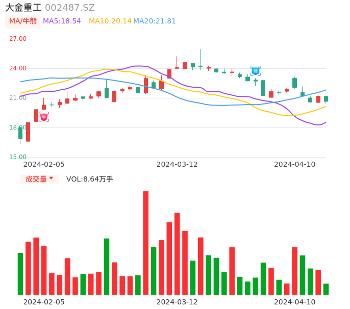 04月10日,大金重工收报20.64,股价涨幅-2.55%,成交金额1.80亿元,换手率1.37%。