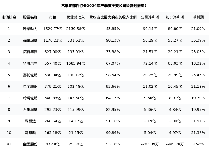 金固股份最新报告期数据为三季度,下表汇总了汽车零部件行业内市值靠前的公司三季度主要经营数据