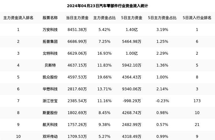 从主力资金流向来看,汽车零部件行业今日主力资金流入66.61亿元,在所有申万二级行业中排名:38/131。