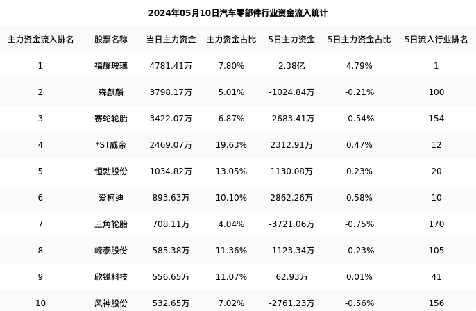 从主力资金流向来看,汽车零部件行业今日主力资金流入61.40亿元,在所有申万二级行业中排名:69/131。