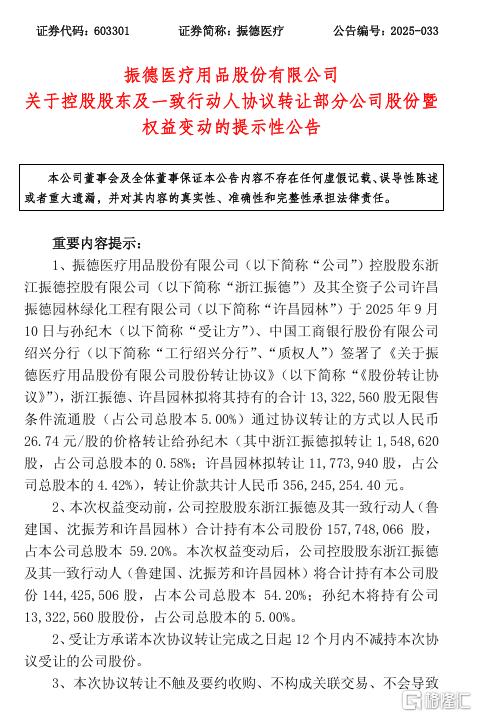 9月11日,振德医疗公告,控股股东浙江振德控股有限公司及子公司许昌园林,通过协议转让方式将5%股份引入投资者孙纪木。