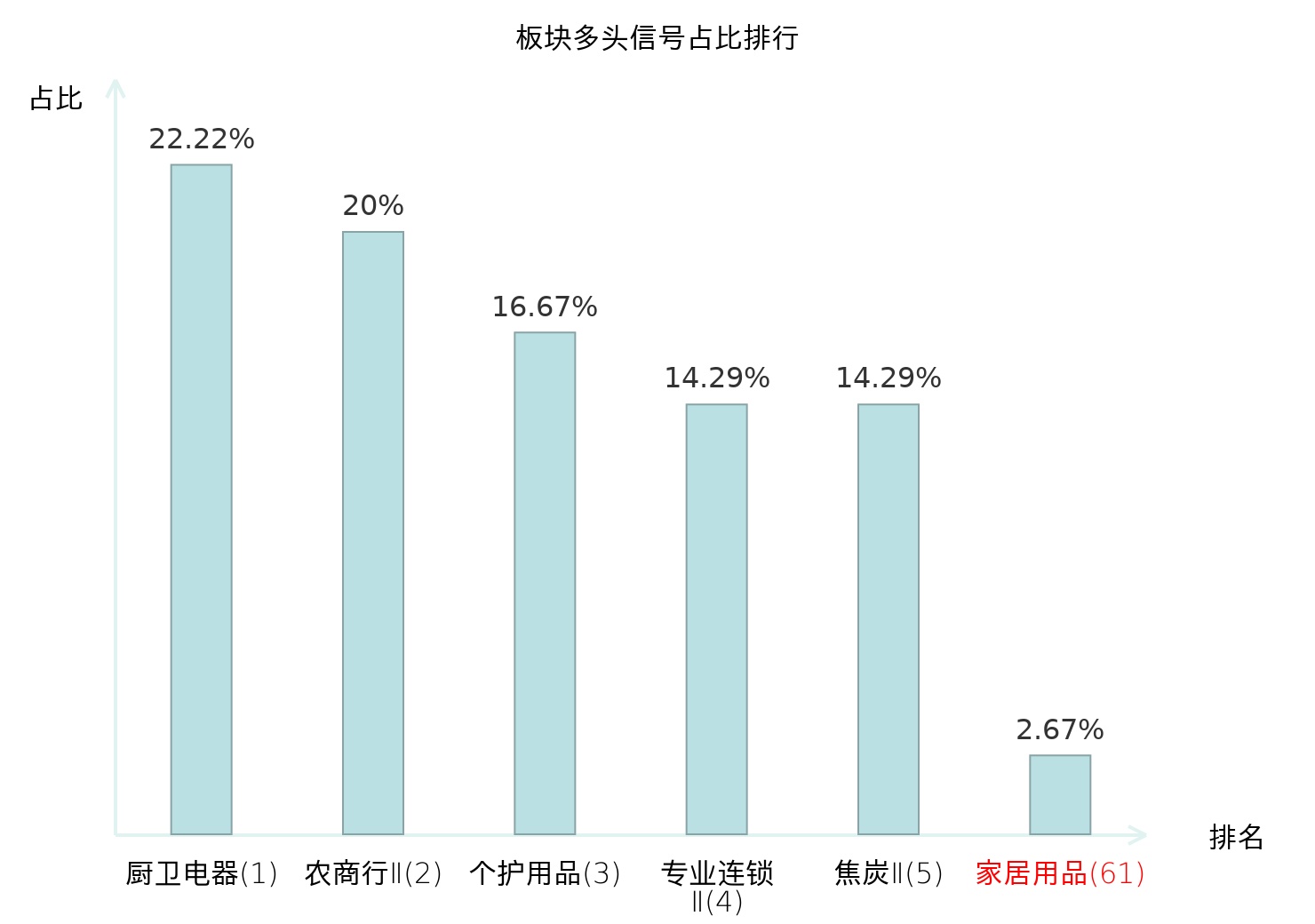 全市场所有行业板块中主力多头信号占比排名中,厨卫电器板块位居第一。专业连锁Ⅱ板块名次提升最快,较昨日上升117位。