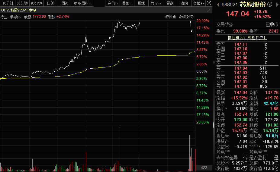 8月20日,半导体IP龙头芯原股份(688521)持续走高,盘中一度封死“20cm”涨停板,股价逼近历史高点。尾盘阶段,该股涨停板被快速打开,收盘涨幅回落至15.52%。