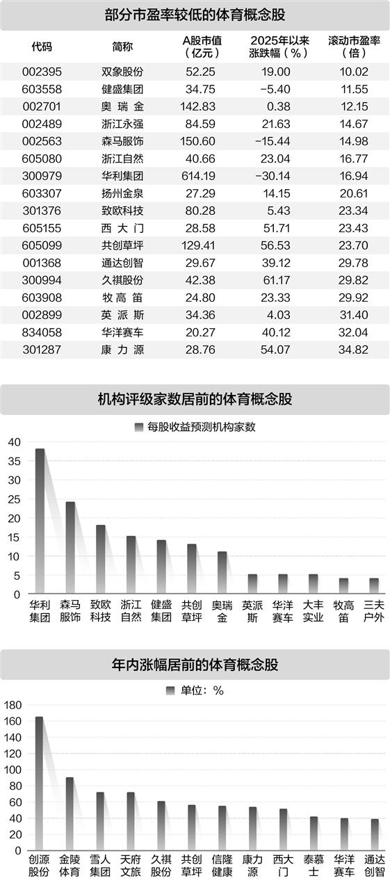 估值水平方面,截至8月20日,14只体育概念股滚动市盈率均低于30倍,其中7股不到20倍,如双象股份、健盛集团、奥瑞金、浙江永强、森马服饰等。