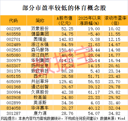 估值水平方面,数据宝统计,截至8月20日收盘,14只体育概念股滚动市盈率(PE)低于30倍,其中7股滚动市盈率不到20倍,如双象股份、健盛集团、奥瑞金、浙江永强、森马服饰等。