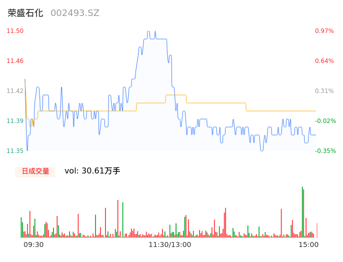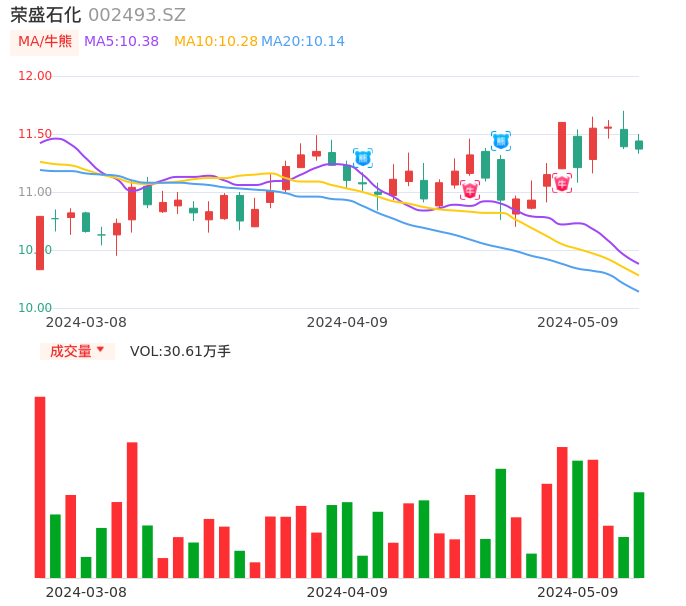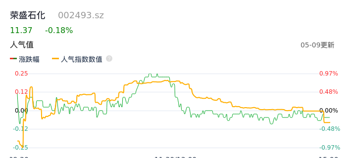 05月09日,荣盛石化收报11.37,股价涨幅-0.18%,成交金额3.49亿元,换手率0.32%。