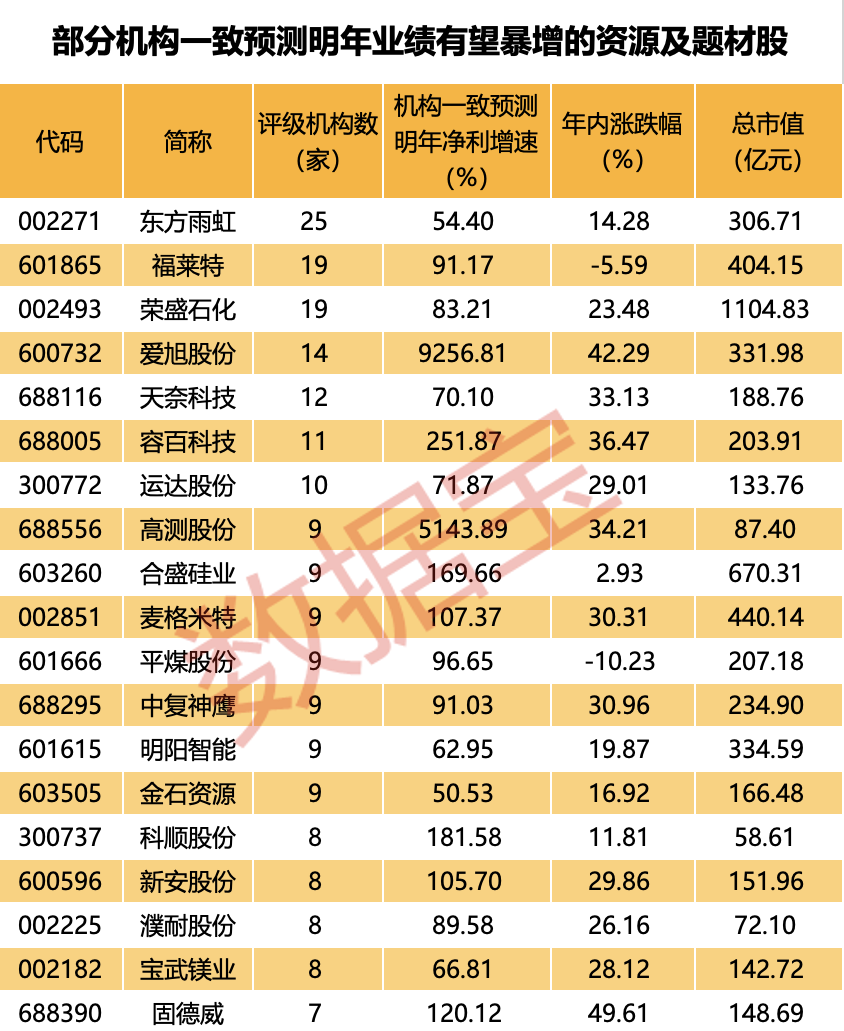 据证券时报·数据宝统计,3家以上机构评级的电力设备、有色金属、钢铁、煤炭、基础化工等行业的个股中,有51股机构一致预测明年净利增速超50%且年内涨幅低于50%。