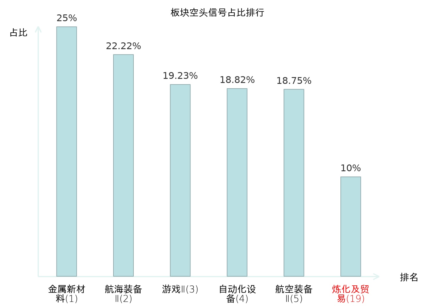 全市场所有行业板块中主力空头信号占比排名中,金属新材料板块位居第一。证券Ⅱ板块名次提升最快,较昨日上升120位。