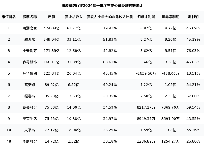 华斯股份最新报告期数据为一季度,下表汇总了服装家纺行业内市值靠前的公司一季度主要经营数据