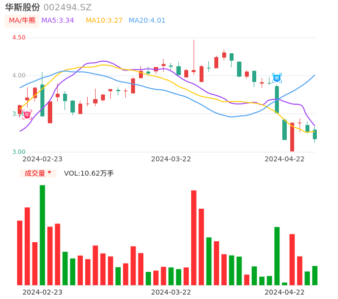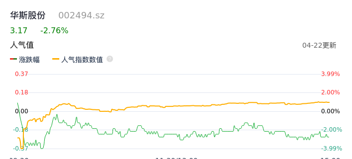 04月22日,华斯股份收报3.17,股价涨幅-2.76%,成交金额3383.29万元,换手率3.70%。