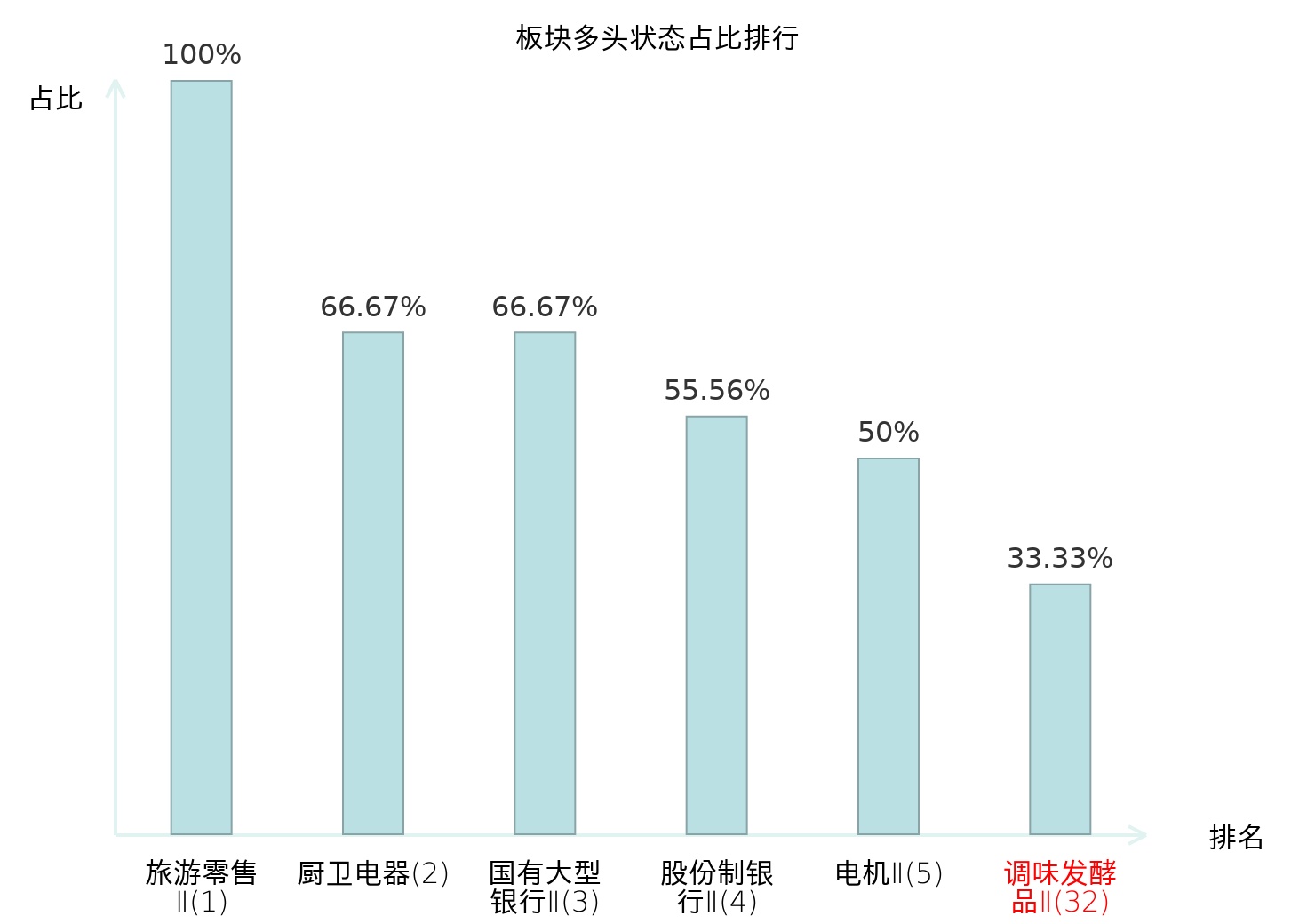 全市场所有行业板块中主力多头状态占比排名中,旅游零售Ⅱ板块位居第一。水泥板块名次提升最快,较昨日上升80位。