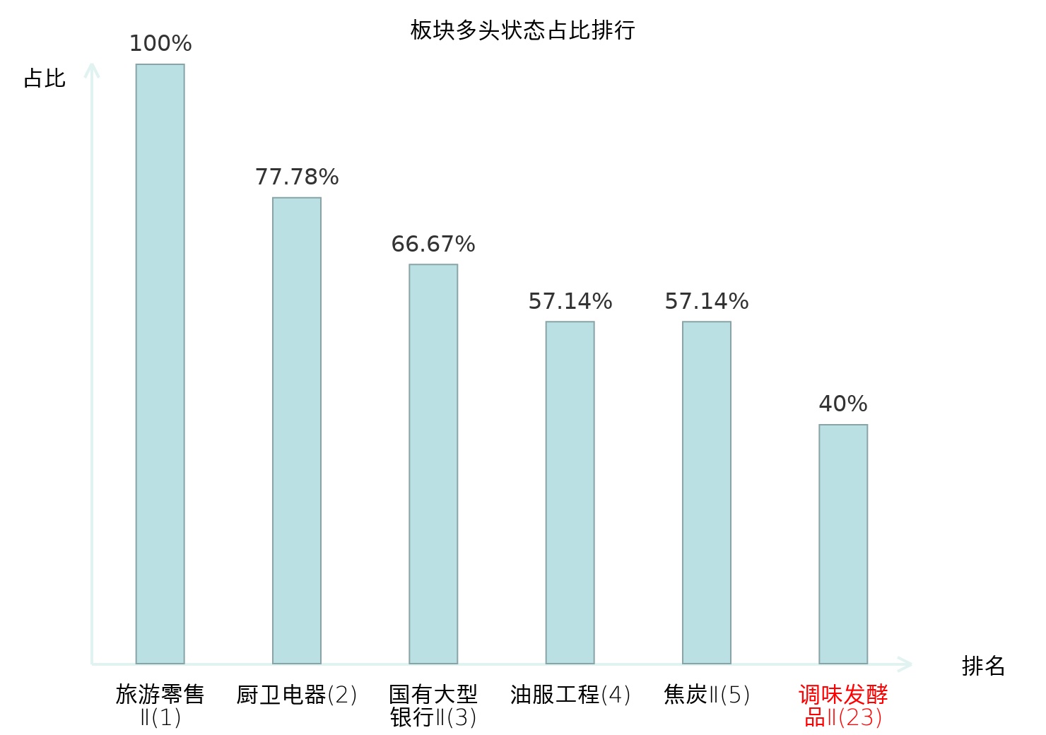 全市场所有行业板块中主力多头状态占比排名中,旅游零售Ⅱ板块位居第一。房地产服务板块名次提升最快,较昨日上升71位。