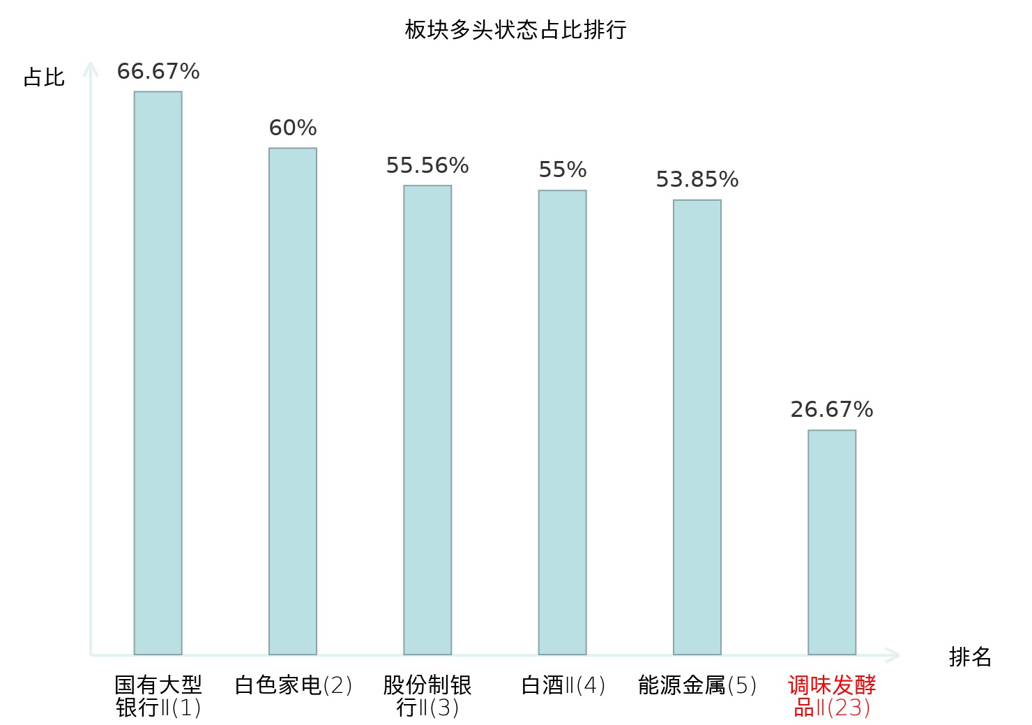 全市场所有行业板块中主力多头状态占比排名中,国有大型银行Ⅱ板块位居第一。林业Ⅱ板块名次提升最快,较昨日上升99位。