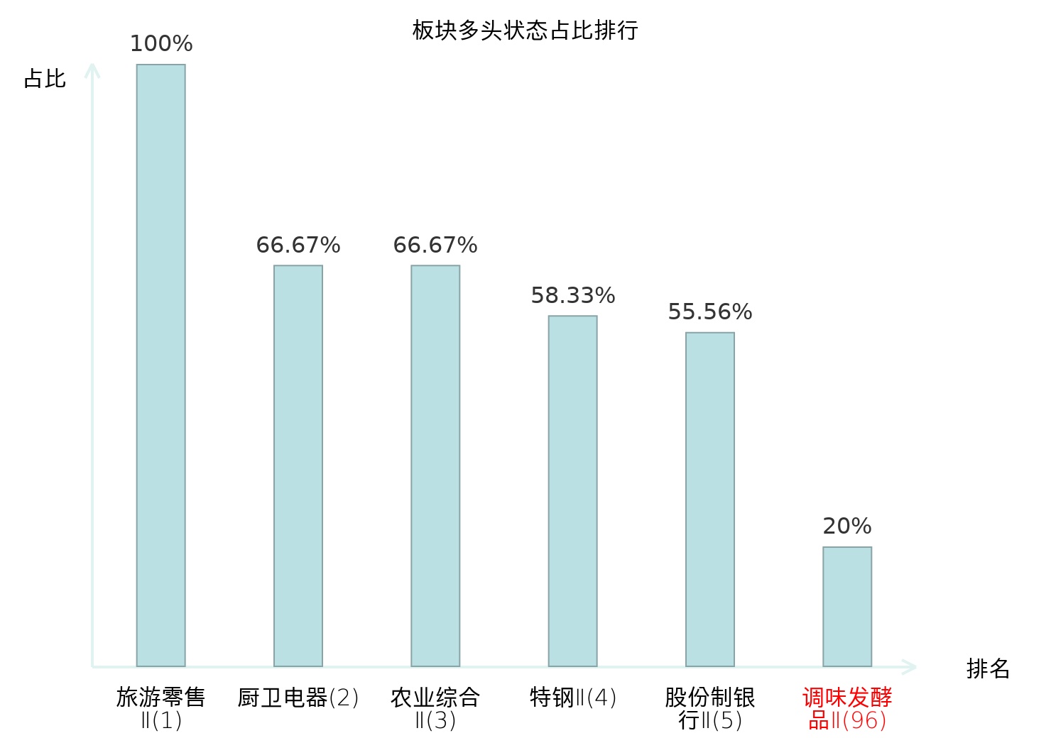 全市场所有行业板块中主力多头状态占比排名中,旅游零售Ⅱ板块位居第一。农商行Ⅱ板块名次提升最快,较昨日上升78位。