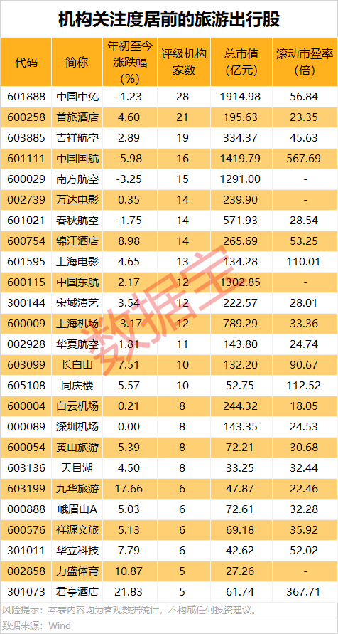 春节假期临近,旅游出行股获得机构密集关注,25股获5家及以上机构评级,占比超过总数的四成,中国中免、首旅酒店评级家数均在20家以上。