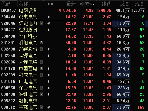 上证报中国证券网讯1月19日早盘,电网设备概念股再度走高,截至10时22分,双杰电气20CM涨停,汉缆股份、森源电气、广电电气、许继电气等多股涨停。