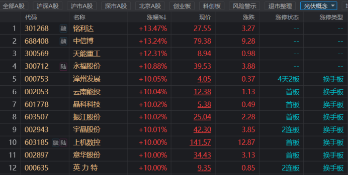 今日(5月19日),三大指数低开走高,截至收盘均录得小幅上涨。赛道股表现继续活跃,光伏、风电、储能等板块涨幅居前。其中,光伏概念股掀起涨停潮,漳州发展、云南能投、晶科科技、振江股份、宇晶股份、意华股份、英力特、上机数控等十余股涨停,铭利达、中信博、天能重工、永福股份涨幅超10%。
