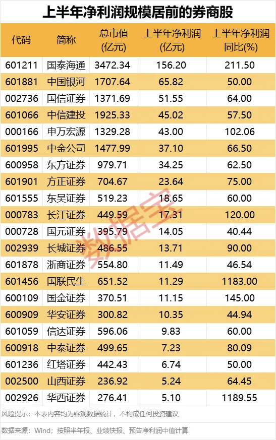 券商股上半年业绩整体向好 21股净利润超5亿元