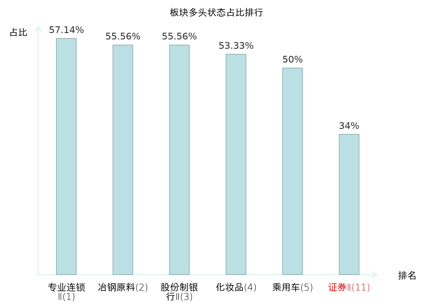 全市场所有行业板块中主力多头状态占比排名中,专业连锁Ⅱ板块位居第一。房地产服务板块名次提升最快,较昨日上升52位。
