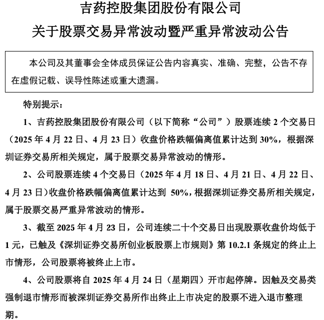 当天收盘后,*ST吉药发布了关于股票交易异常波动暨严重异常波动公告。公司股票连续2个交易日(2025年4月22日、4月23日)收盘价格跌幅偏离值累计达到30%。同时,连续4个交易日(4月18日、4月21日、4月22日、4月23日)收盘价格跌幅偏离值累计达到50%,根据深交所相关规定,属于股票交易严重异常波动的情形。