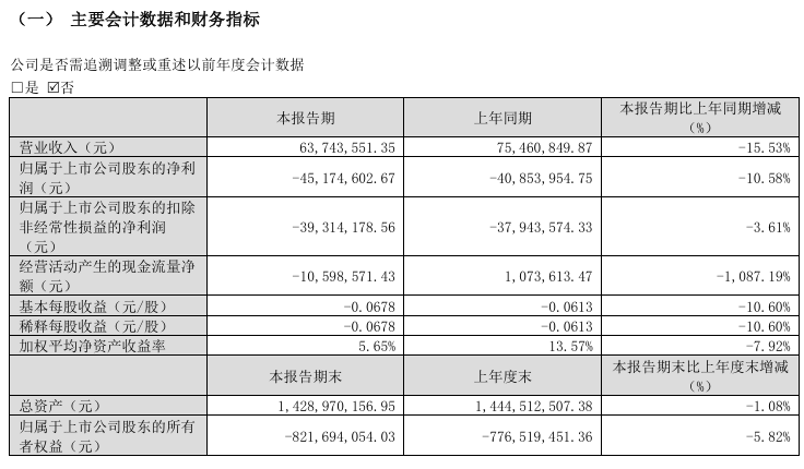 公司2025年一季报显示,报告期内,公司实现营收6374万元,同比下降15.53%;净利润亏损4517万元,去年同期亏损4085万元。